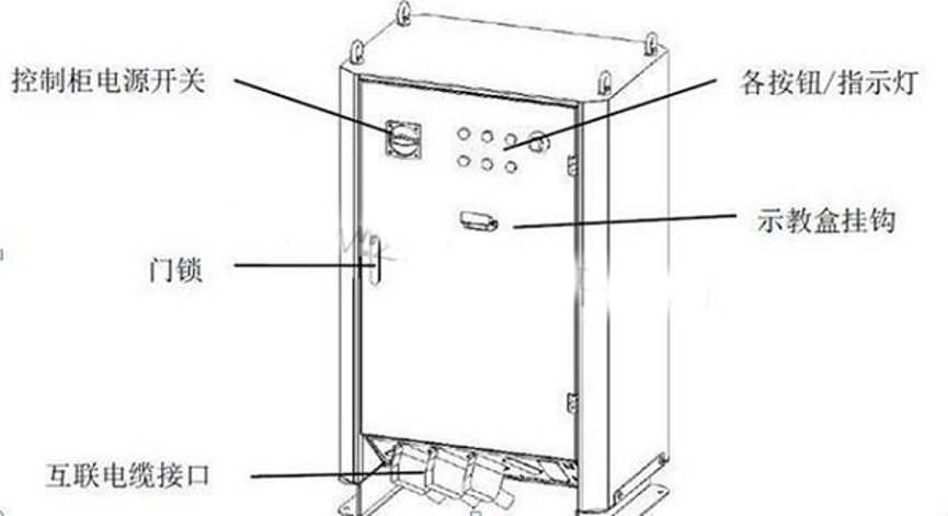 工業(yè)機器人控制柜,前面板上有控制柜電源開關、門鎖以及各按鈕/指示燈,示教盒懸掛在按鈕下方的掛鉤上,控制柜底部是互聯(lián)電纜接口,例如下圖供工業(yè)機器人控制柜示意圖: